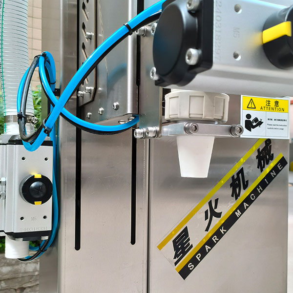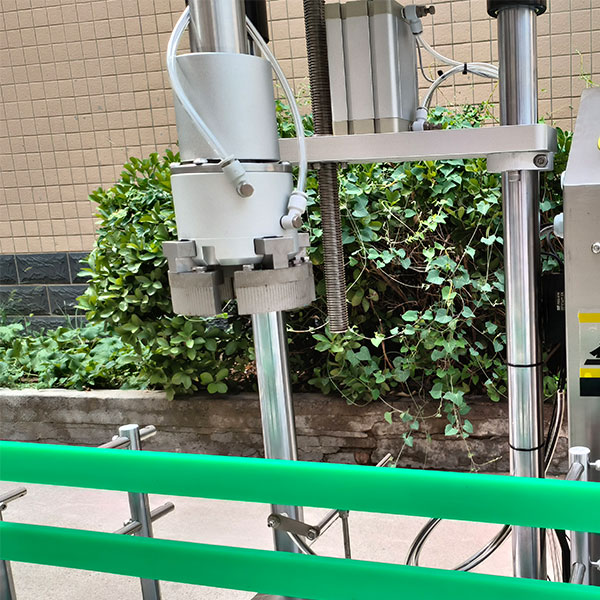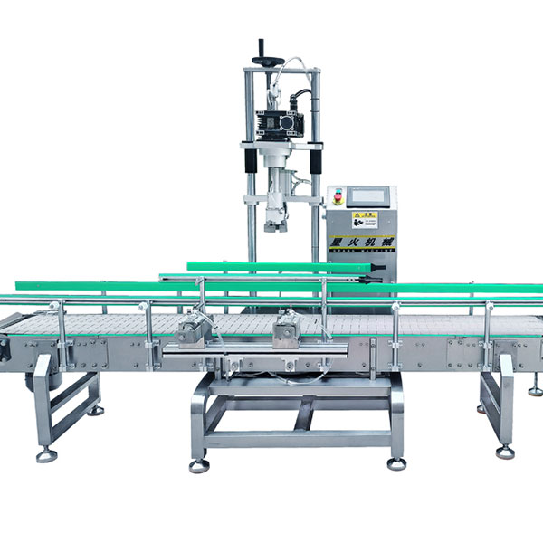 灌裝旋蓋一體機的工作模式是基于精準的軟件控制運作,具體的操作主要依靠于PLC可編程的信息攝入,將需要的旋蓋位置調整在合適容器桶的高度,并在微電腦顯示屏幕當中設置好旋轉扭矩,按下大型單頭稱重灌裝旋蓋機的啟動鍵,灌裝旋蓋一體機輸送帶將空的容器桶輸送至灌裝工位,并將其定位,隨后稱重感應控制器自動清零,灌裝頭下降至指定位置開始對準容器口進行灌裝作業,過程中稱重系統將會實時檢測重量信息的變化,并將重量參數反饋給顯示屏,便于用戶查看,灌裝結束后,灌裝好的容器順著輸送帶被送至旋蓋工位,旋蓋頭將開始根據容器自動調節扭矩,經過下壓旋轉完成密封旋蓋的動作,整個運作全部依賴于軟件配合設備來執行。